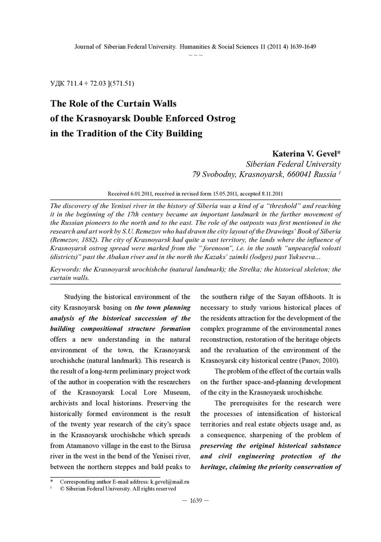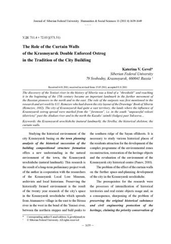 Библиографическое описание:Gevel, Katerina. The Role of the Curtain Walls of the Krasnoyarsk Double Enforced Ostrog in the Tradition of the City Building = Влияние куртин крепости Красноярского двойного острога на традиции формирования застройки города / K. V. Gevel. - Текст : непосредственный // Журнал Сибирского федерального университета. Гуманитарные науки. - 2011. - Т. 4, № 11. - С. 1639-1649. - Библиогр.: с. 1648-1649. - ISSN 1997-1370.