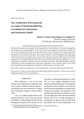 Библиографическое описание:Tarasova, Maria. The Architecture of Krasnoyarsk as a Space of Social Identification. Correlation of Cosmocentric and Sociocentric Ideals = Архитектура города Красноярска как пространство социальной идентификации. Соотношение космоцентрических и социоцентрических идеалов / M. V. Tarasova, Tamara Yu. Grigorieva. - Текст : непосредственный // Журнал Сибирского федерального университета. Гуманитарные науки. - 2011. - Т. 4, № 12. - С. 1705-1718. - Библиогр.: с. 1715-1718. - ISSN 1997-1370.