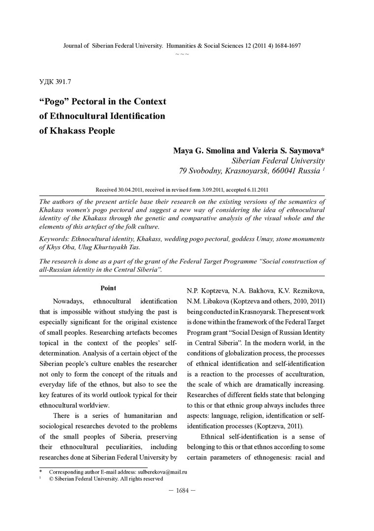 Библиографическое описание:Smolina, Maya. Pogo Pectoral in the Context of Ethnocultural Identification of Khakass People = Нагрудное украшение пого в контексте этнокультурной идентификации хакасского народа / M. G. Smolina, V. S. Saymova. - Текст : непосредственный // Журнал Сибирского федерального университета. Гуманитарные науки. - 2011. - Т. 4, № 12. - С. 1684-1697. - Библиогр.: с. 1695-1697. - ISSN 1997-1370.
