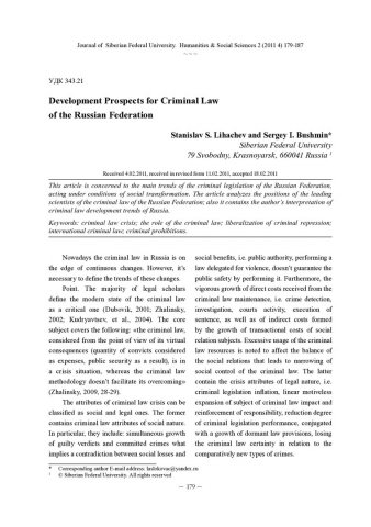 Библиографическое описание:Lihachev, Stanislav. Development Prospects for Criminal Law of the Russian Federation = Направления совершенствования уголовного законодательства РФ / S. S. Lihachev, S. I. Bushmin. - Текст : непосредственный // Журнал Сибирского федерального университета. Гуманитарные науки. - 2011. - Т. 4, № 2. - С. 179-187. - Библиогр.: с. 186-187. - ISSN 1997-1370.