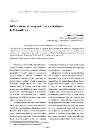 Библиографическое описание:Pitetsky, Valery. Differentiation of Levity and Criminal Negligence in Criminal Law = Разграничение легкомыслия и преступной небрежности в уголовном праве / V. V. Pitetsky. - Текст : непосредственный // Журнал Сибирского федерального университета. Гуманитарные науки. - 2011. - Т. 4, № 2. - С. 230-234. - ISSN 1997-1370.