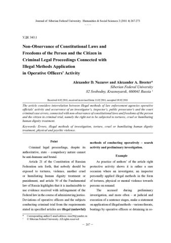 Библиографическое описание:Nazarov, Alexander. Non-Observance of Constitutional Laws and Freedoms of the Person and the Citizen in Criminal Legal Proceedings Connected with Illegal Methods Application in Operative Officers Activity = Несоблюдение в уголовном судопроизводстве конституционных прав и свобод человека и гражданина, связанное с применением незаконных методов в деятельности оперативных работников / A. D. Nazarov, A. A. Brester. - Текст : непосредственный // Журнал Сибирского федерального университета. Гуманитарные науки. - 2011. - Т. 4, № 2. - С. 267-273. - Библиогр.: с. 272-273. - ISSN 1997-1370.