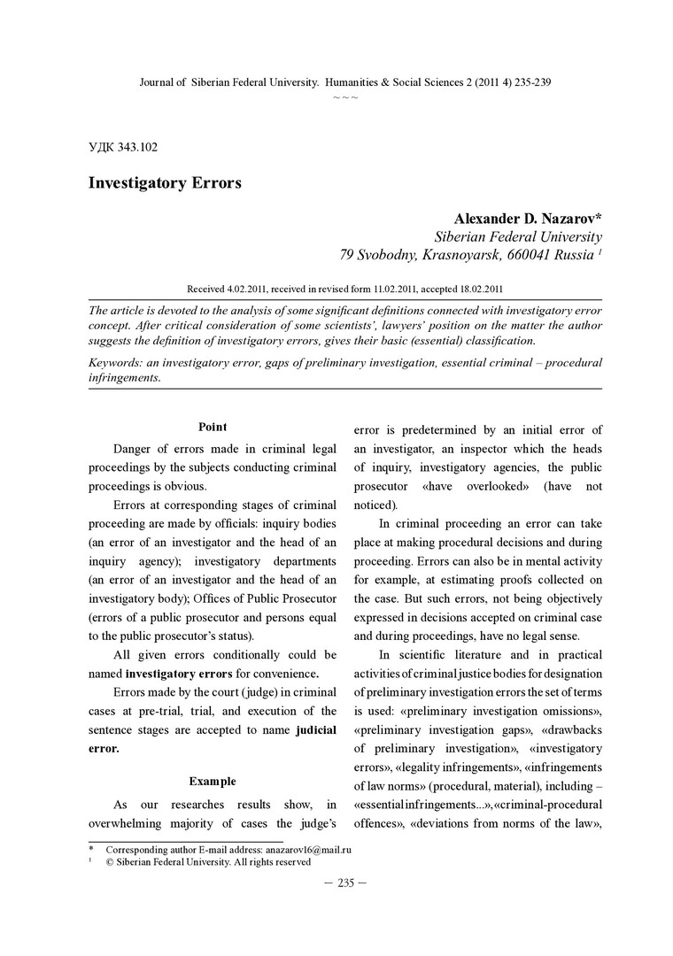 Библиографическое описание: Nazarov, Alexander. Investigatory Errors = Понятие и основная классификация следственных ошибок / A. D. Nazarov. - Текст : непосредственный // Журнал Сибирского федерального университета. Гуманитарные науки. - 2011. - Т. 4, № 2. - С. 235-239. - Библиогр.: с. 238-239. - ISSN 1997-1370.