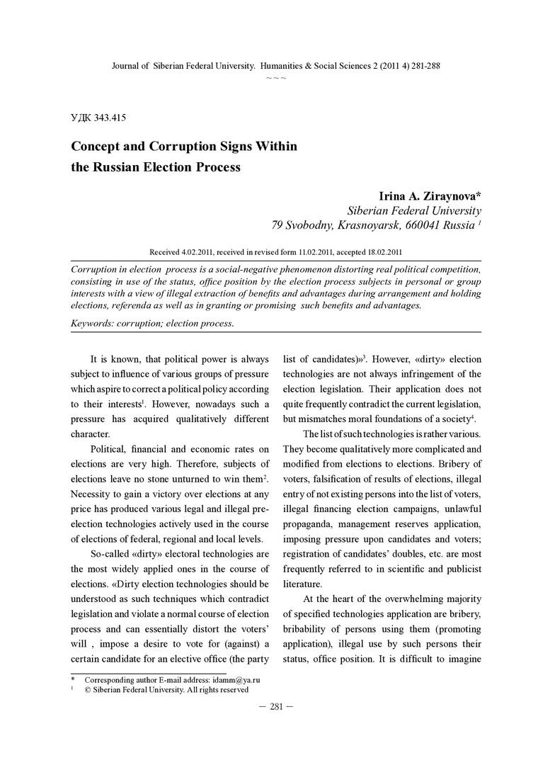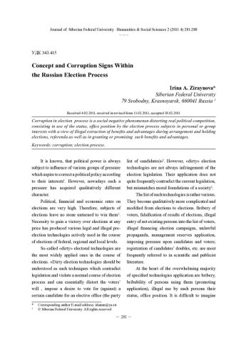 Библиографическое описание:Ziraynova, Irina. Concept and Corruption Signs Within the Russian Election Process = Понятие и признаки коррупции в российском избирательном процессе / I. A. Ziraynova. - Текст : непосредственный // Журнал Сибирского федерального университета. Гуманитарные науки. - 2011. - Т. 4, № 2. - С. 281-288. - Библиогр.: с. 287-288. - ISSN 1997-1370.