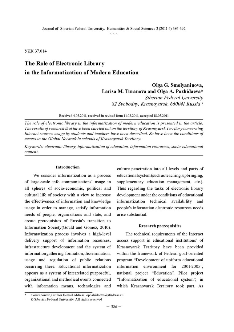 Библиографическое описание:Smolyaninova, Olga. The Role of Electronic Library in the Informatization of Modern Education = Электронная библиотека в условиях информатизации образования / O. G. Smolyaninova, L. M. Turanova, O. A. Pozhidaeva. - Текст : непосредственный // Журнал Сибирского федерального университета. Гуманитарные науки. - 2011. - Т. 4, № 3. - С. 386-392. - Библиогр.: с. 392. - ISSN 1997-1370.