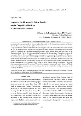 Библиографическое описание:Kolesnik, E`duard G... Impact of the Grunewald Battle Results on the Geopolitical Position of the Moscovia Tsardom = Влияние итогов Грюнвальдской битвы на геополитическое положение Московской Руси / E. G. Kolesnik, M. G. Tarasov. - Текст : непосредственный // Журнал Сибирского федерального университета. Гуманитарные науки. - 2011. - Т. 4, № 4. - С. 469-475. - Библиогр.: с. 474-475. - ISSN 1997-1370.