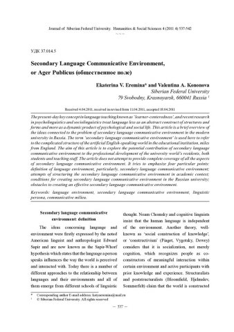 Библиографическое описание:Eremina, Ekaterina. Secondary Language Communicative Environment, or Ager Publicus = Вторичная языковая среда, или общественное поле / E. V. Eremina, V. A. Kononova. - Текст : непосредственный // Журнал Сибирского федерального университета. Гуманитарные науки. - 2011. - Т. 4, № 4. - С. 537-542. - Библиогр.: с. 541-542. - ISSN 1997-1370.