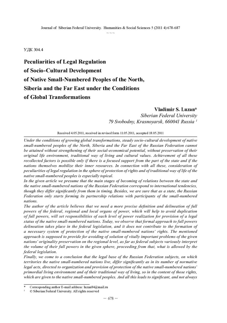 Библиографическое описание:Luzan, Vladimir. Peculiarities of Legal Regulation of Socio-Cultural Development of Native Small-Numbered Peoples of the North, Siberia and the Far East under the Conditions of Global Transformations = Особенности правового регулирования социокультурного развития коренных малочисленных народов Севера, Сибири и Дальнего Востока в условиях глобальных трансформаций / V. S. Luzan. - Текст : непосредственный // Журнал Сибирского федерального университета. Гуманитарные науки. - 2011. - Т. 4, № 5. - С. 678-687. - Библиогр.: с. 685-687. - ISSN 1997-1370.