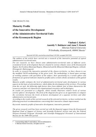 Библиографическое описание:Kirko, Vladimir. Maturity Profile of the Innovative Development of the Administrative-Territorial Units of the Krasnoyarsk Region = Профиль зрелости инновационного развития административно-территориальных образований Красноярского края / V. I. Kirko, A. V. Bukharov, A. V. Keusch. - Текст : непосредственный // Журнал Сибирского федерального университета. Гуманитарные науки. - 2011. - Т. 4, № 5. - С. 667-677. - Библиогр.: с. 676-677. - ISSN 1997-1370.