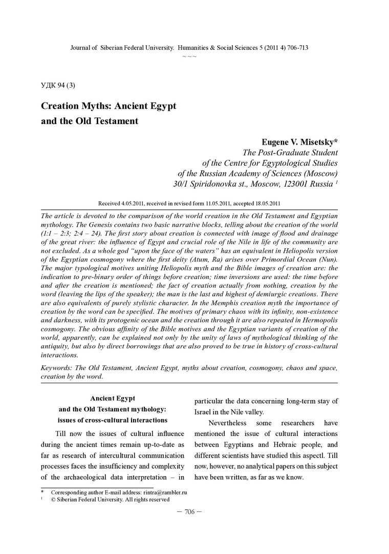 Библиографическое описание:Misetsky, Eugene. Creation Myths: Ancient Egypt and the Old Testament = Мифология творения: Египет и Ветхий Завет / E. V. Misetsky. - Текст : непосредственный // Журнал Сибирского федерального университета. Гуманитарные науки. - 2011. - Т. 4, № 5. - С. 706-713. - Библиогр.: с. 712-713. - ISSN 1997-1370.