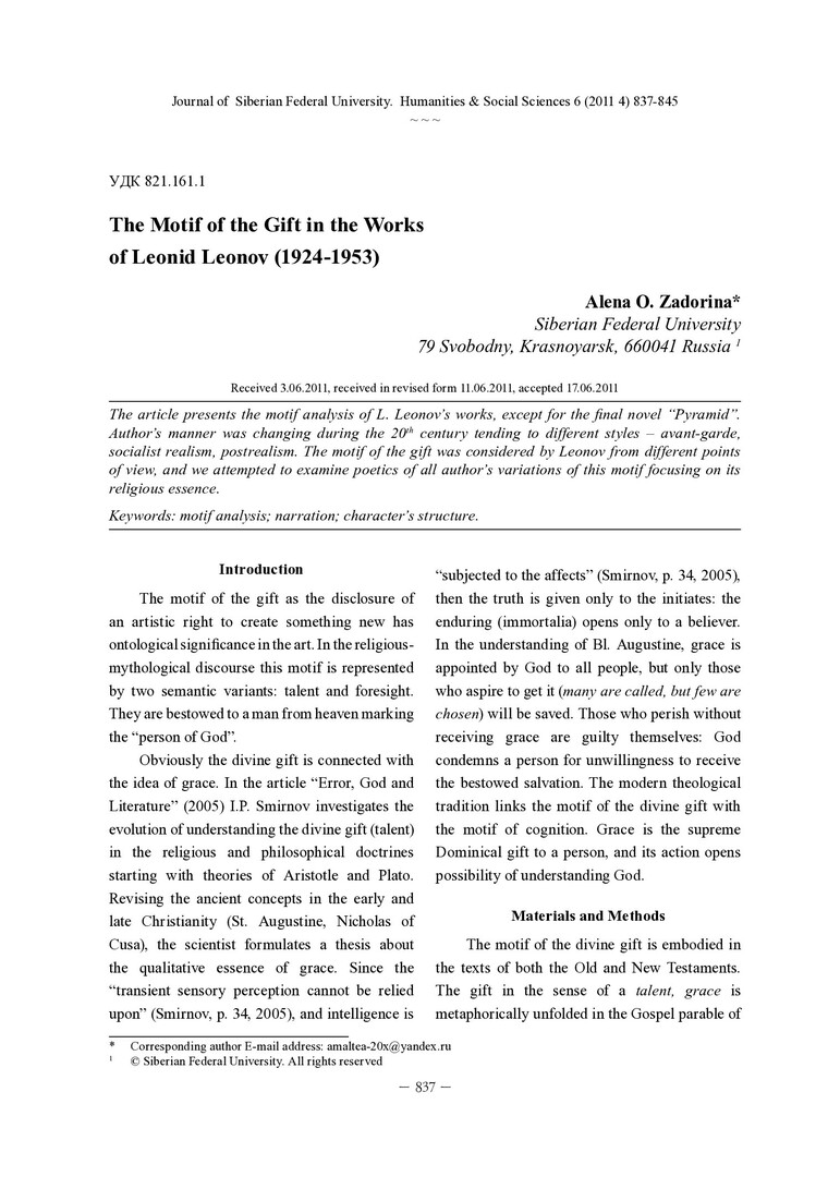 Библиографическое описание:Zadorina, Alena. The Motif of the Gift in the Works of Leonid Leonov (1924-1953) = Мотив дара в прозе Леонида Леонова (1924-1953) / A. O. Zadorina. - Текст : непосредственный // Журнал Сибирского федерального университета. Гуманитарные науки. - 2011. - Т. 4, № 6. - С. 837-845. - Библиогр.: с. 844-845. - ISSN 1997-1370.