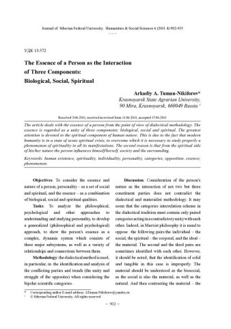 Библиографическое описание:Tuman-Nikiforov, Arkadiy. Сущность человека как взаимодействие трех составляющих: биологической, социальной, духовной = The Essence of a Person as the Interaction of Three Components: Biological, Social, Spiritual / A. A. Tuman-Nikiforov. - Текст : непосредственный // Журнал Сибирского федерального университета. Гуманитарные науки. - 2011. - Т. 4, № 6. - С. 902-915. - Библиогр.: с. 913-915. - ISSN 1997-1370.