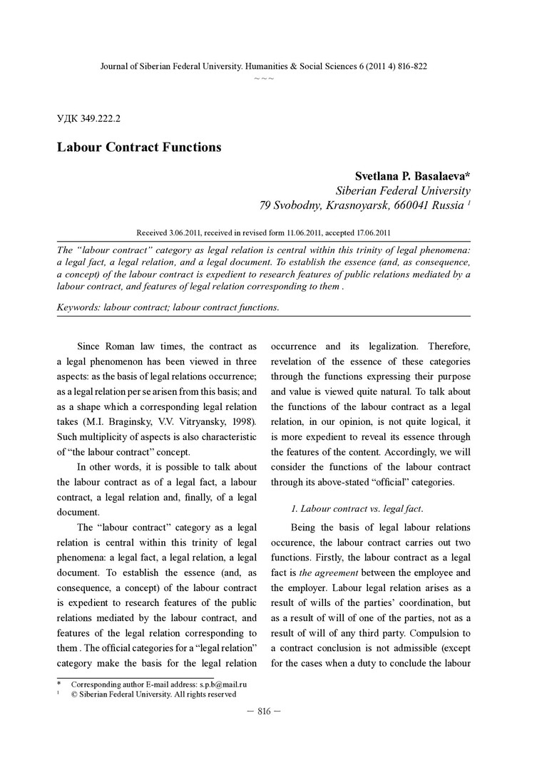Библиографическое описание:Basalaeva, Svetlana. Labour Contract Functions = Функции трудового договора / S. P. Basalaeva. - Текст : непосредственный // Журнал Сибирского федерального университета. Гуманитарные науки. - 2011. - Т. 4, № 6. - С. 816-822. - ISSN 1997-1370.