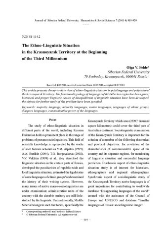 Библиографическое описание:Felde, Olga. The Ethno-Linguistic Situation in the Krasnoyarsk Territory at the Beginning of the Third Millennium = Этноязыковая ситуация Красноярского края в начале третьего тысячелетия / O. V. Felde. - Текст : непосредственный // Журнал Сибирского федерального университета. Гуманитарные науки. - 2011. - Т. 4, № 7. - С. 919-929. - Библиогр.: с. 927. - ISSN 1997-1370.