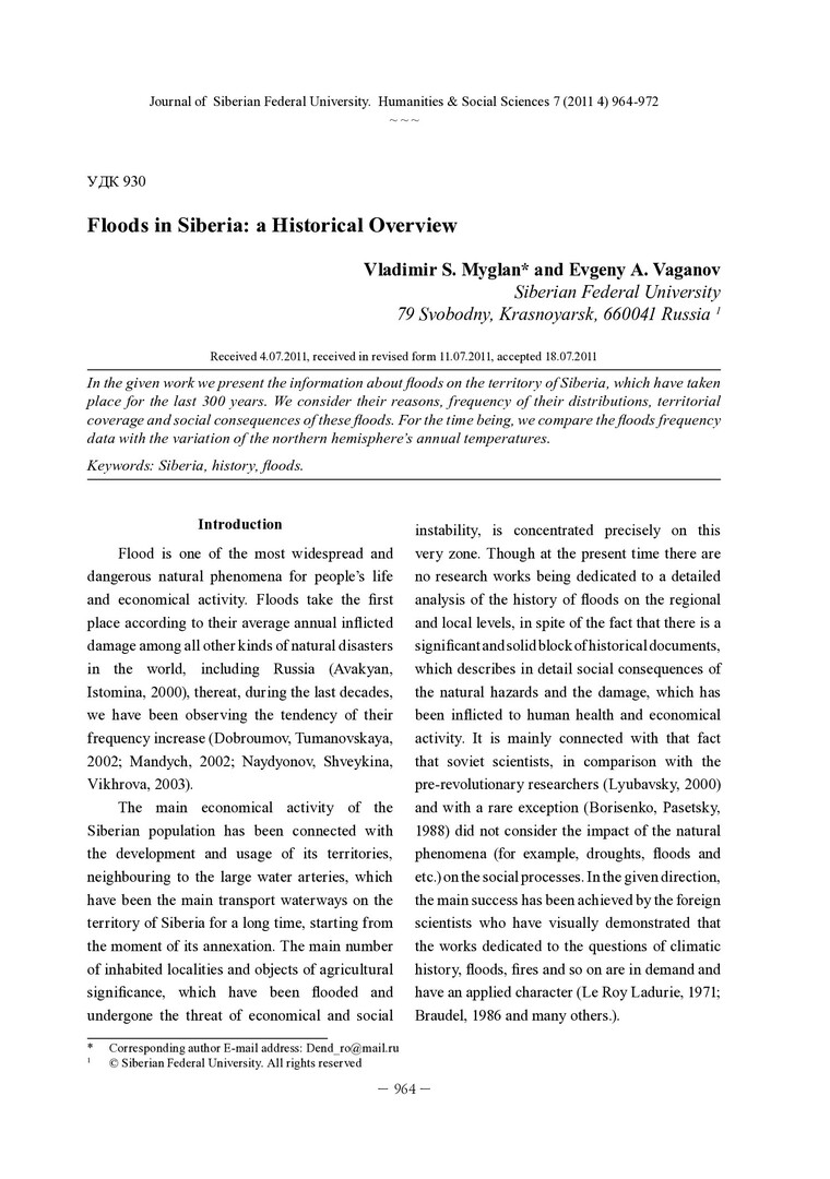 Библиографическое описание:My`glan, Vladimir S... Floods in Siberia: a Historical Overview = Наводнения в Сибири: исторический очерк / V. S. Myglan, E. A. Vaganov. - Текст : непосредственный // Журнал Сибирского федерального университета. Гуманитарные науки. - 2011. - Т. 4, № 7. - С. 964-972. - Библиогр.: с. 970-972. - ISSN 1997-1370.