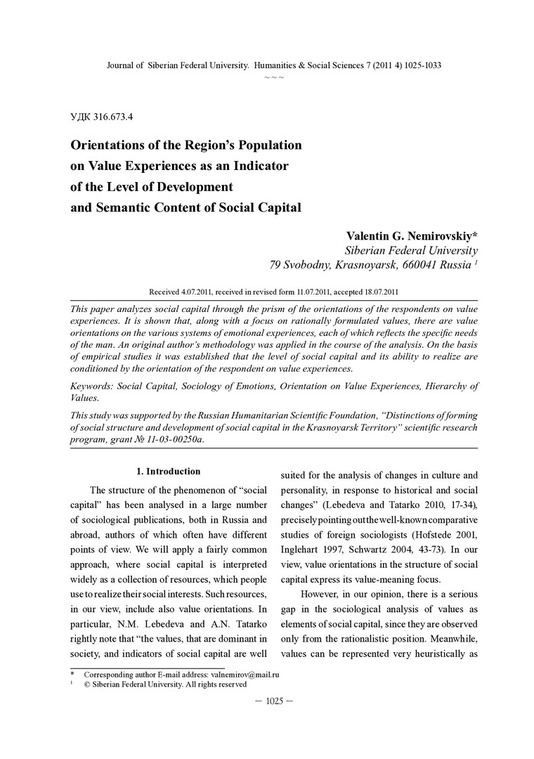 Библиографическое описание:Nemirovskiy, Valentin. Orientations of the Regions Population on Value Experiences as an Indicator of the Level of Development and Semantic Content of Social Capital = Ориентации населения региона на ценностные переживания как показатель уровня развития и смыслового содержания социального капитала / V. G. Nemirovskiy. - Текст : непосредственный // Журнал Сибирского федерального университета. Гуманитарные науки. - 2011. - Т. 4, № 7. - С. 1025-1033. - Библиогр.: с. 1031-1033. - ISSN 1997-1370.