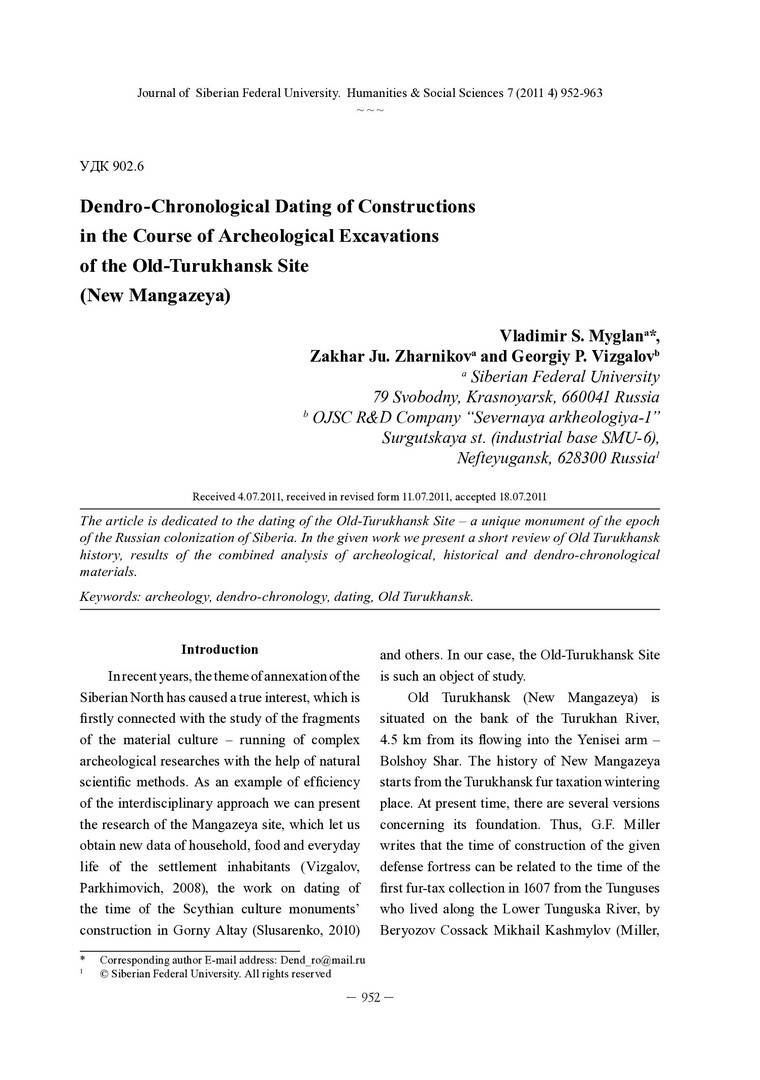 Библиографическое описание:My`glan, Vladimir S... Constructions in the Course of Archeological Excavations of the Old-Turukhansk Site (New Mangazeya) = Dendro-Chronological Dating of Дендрохронологическая датировка строений из археологических раскопок Старо-Туруханского городища (Новой Мангазеи) / V. S. Myglan, Z. Ju. Zharnikov, G. P. Vizgalov. - Текст : непосредственный // Журнал Сибирского федерального университета. Гуманитарные науки. - 2011. - Т. 4, № 7. - С. 952-963. - Библиогр.: с. 962-963. - ISSN 1997-1370.