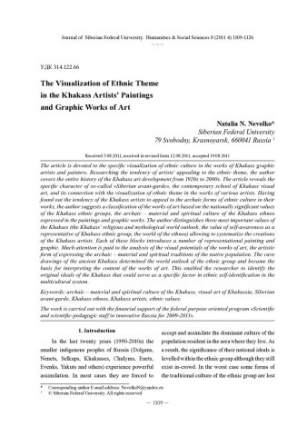 Библиографическое описание:Nevolko, Natalia. The Visualization of Ethnic Theme in the Khakass Artists Paintings and Graphic Works of Art = Визуализация этнической темы в живописных и графических произведениях искусства хакасских мастеров / N. N. Nevolko. - Текст : непосредственный // Журнал Сибирского федерального университета. Гуманитарные науки. - 2011. - Т. 4, № 8. - С. 1109-1126. - Библиогр.: с. 1124-1126. - ISSN 1997-1370.