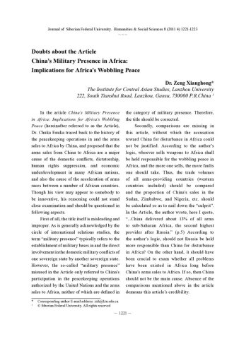 Библиографическое описание:Xianghong, Zeng. Doubts about the Article Chinas Military Presence in Africa: Implications for Africas Wobbling Peace / Zeng Xianghong. - Текст : непосредственный // Журнал Сибирского федерального университета. Гуманитарные науки. - 2011. - Т. 4, № 8. - С. 1221-1223. - ISSN 1997-1370.