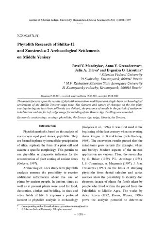 Библиографическое описание:Phytolith Research of Shilka-12 and Zaostrovka-2 Archaeological Settlements on Middle Yenisey = Фитолитные исследования археологических поселений Шилка-12 и Заостровка-2 на Среднем Енисее / P. V. Mandryka, A. V. Grenaderova, J. A. Titova, E. О. Lisyutina. - Текст : непосредственный // Журнал Сибирского федерального университета. Гуманитарные науки. - 2011. - Т. 4, № 8. - С. 1088-1099. - Библиогр.: с. 1097-1099. - ISSN 1997-1370.