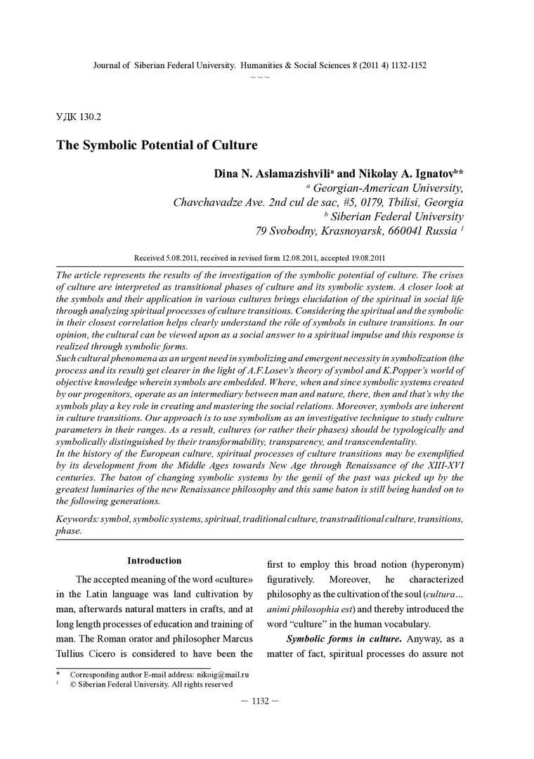 Библиографическое описание:Aslamazishvili, Dina. The Symbolic Potential of Culture = Символический потенциал культуры / D. N. Aslamazishvili, N. A. Ignatov. - Текст : непосредственный // Журнал Сибирского федерального университета. Гуманитарные науки. - 2011. - Т. 4, № 8. - С. 1132-1152. - Библиогр.: с. 1150-1152. - ISSN 1997-1370.