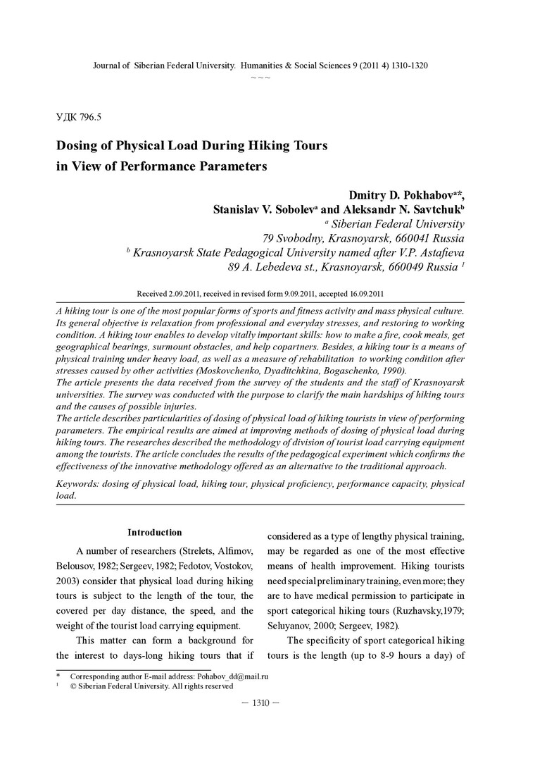 Библиографическое описание:Pokhabov, Dmitry. Dosing of Physical Load During Hiking Tours in View of Performance Parameters = Дозирование физической нагрузки в туристском походе с учетом показателей работоспособности / D. D. Pokhabov, S. V. Sobolev, A. N. Savtchuk. - Текст : непосредственный // Журнал Сибирского федерального университета. Гуманитарные науки. - 2011. - Т. 4, № 9. - С. 1310-1320. - Библиогр.: с. 1317-1320. - ISSN 1997-1370.