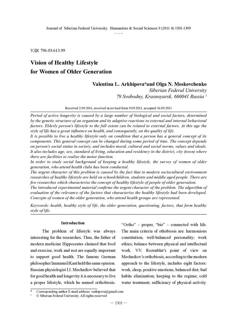 Библиографическое описание:Arkhipova, Valentina. Vision of Healthy Lifestyle for Women of Older Generation = Представления женщин старшего поколения о здоровом образе жизни / V. L. Arkhipova, O. N. Moskovchenko. - Текст : непосредственный // Журнал Сибирского федерального университета. Гуманитарные науки. - 2011. - Т. 4, № 9. - С. 1301-1309. - Библиогр.: с. 1307-1309. - ISSN 1997-1370.