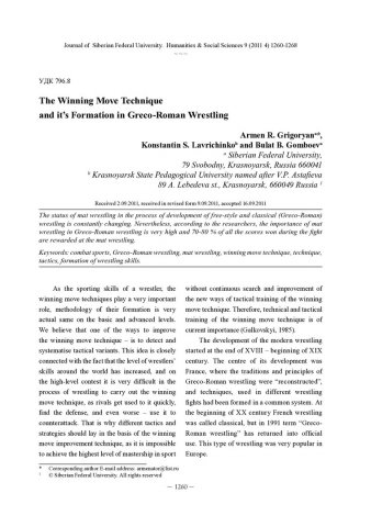 Библиографическое описание:Grigoryan, Armen. The Winning Move Technique and its Formation in Greco-Roman Wrestling = Коронный прием в партере и его формирование в греко-римской борьбе / A. R. Grigoryan, K. S. Lavrichinko, B. B. Gomboev. - Текст : непосредственный // Журнал Сибирского федерального университета. Гуманитарные науки. - 2011. - Т. 4, № 9. - С. 1260-1268. - Библиогр.: с. 1265-1268. - ISSN 1997-1370.