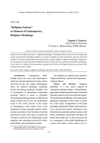 Библиографическое описание: Ivanova, Evgenia. "Religious Fantasy" as Element of Contemporary Religious Mythology = "Религиозное фэнтези" как элемент современной религиозной мифологии / E.V. Ivanova. - Текст : непосредственный // Журнал Сибирского федерального университета. Гуманитарные науки. - 2012. - Т. 5, № 1. - С. 56-62. - Библиогр.: с. 61. - ISSN 1997-1370.