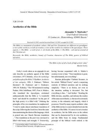 Библиографическое описание:Medvedev, Alexander. Aesthetics of the Bible = Эстетика Библии / A. V. Medvedev. - Текст : непосредственный // Журнал Сибирского федерального университета. Гуманитарные науки. - 2012. - Т. 5, № 1. - С. 127-135. - Библиогр.: с. 134-135. - ISSN 1997-1370.