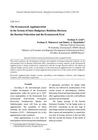 The Krasnoyarsk Agglomeration in the System of Inter-Budgetary relations Betweenстатья из журнала