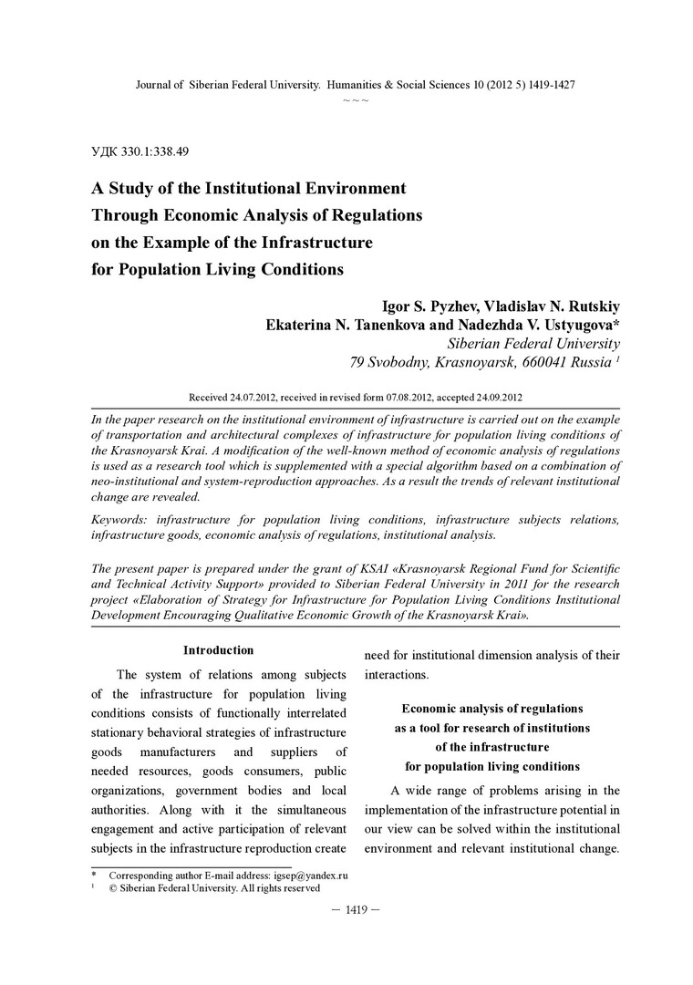 Библиографическое описание:A Study of the Institutional Environment Throuh Economic Analysis of Regulations on the Example of the Infrastructure for Population Living Conditions = Исследование институциональной среды посредством экономического анализа нормативных актов на примере инфраструктуры жизнедеятельности населения / I. S. Pyzhev [et al.]. - Текст : непосредственный // Журнал Сибирского федерального университета. Гуманитарные науки. - 2012. - Т. 5, № 10. - С. 1419-1427. - Библиогр.: с. 1426-1427. - ISSN 1997-1370.
