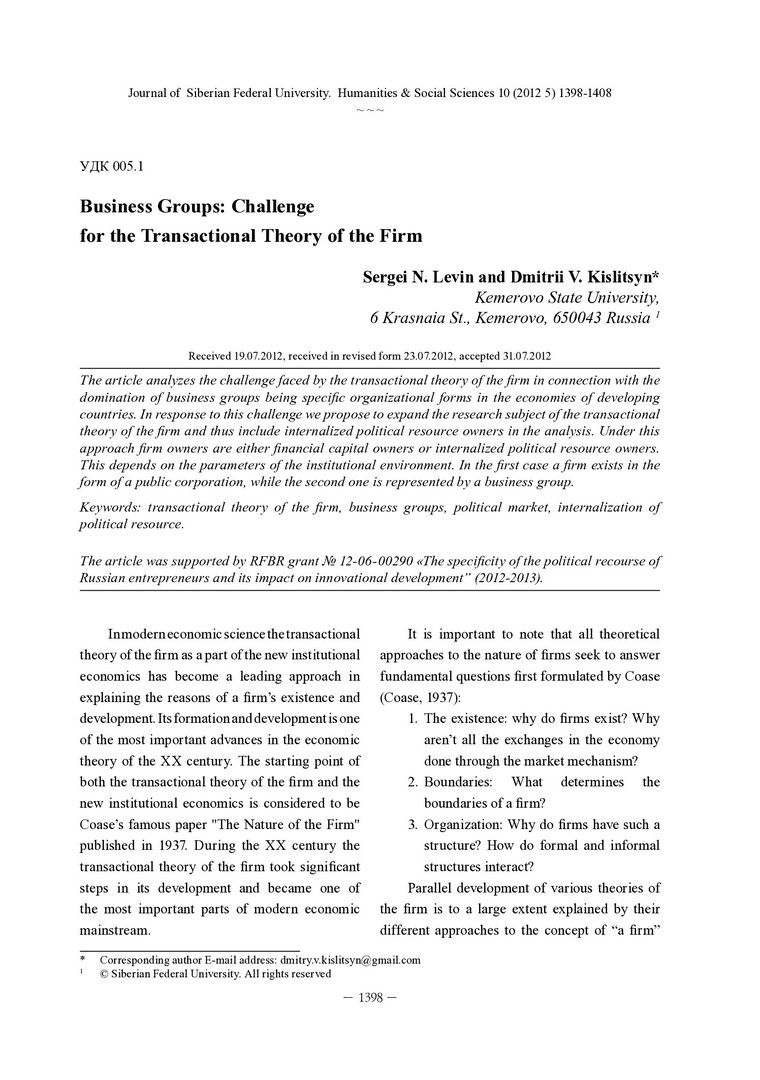 Библиографическое описание: Levin, Sergei. Business Groups: Challenge for the Transactional Theory of the Firm = Бизнес-группа: вызов для трансакционной теории фирмы / S. N. Levin, D. V. Kislitsyn. - Текст : непосредственный // Журнал Сибирского федерального университета. Гуманитарные науки. - 2012. - Т. 5, № 10. - С. 1398-1408 : ил. - Библиогр.: с. 1407-1408. - ISSN 1997-1370.