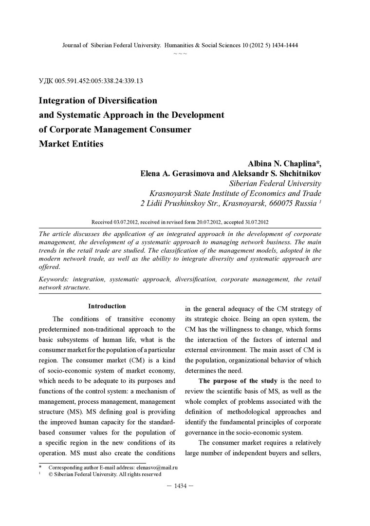 Библиографическое описание:Chaplina, Albana. Integration of Diversificatoin and Systematic Approach in the Development of Corporate Management Consumer Market Entities = Интеграция диверсификации и системного подхода в развитии корпоративного управления субъектами хозяйствования потребительского рынка / A. N. Chaplina, E. A. Gerasimova, A. S. Shchitnikov. - Текст : непосредственный // Журнал Сибирского федерального университета. Гуманитарные науки. - 2012. - Т. 5, № 10. - С. 1434-1444 : ил. - Библиогр.: с. 1443. - ISSN 1997-1370.
