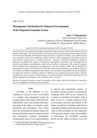 Библиографическое описание:Filimonenko, Irina. Management Mechanism For Balanced Development of the Regional Economic System = Механизм управления сбалансированным развитием региональной экономической системы / I. V. Filimonenko. - Текст : непосредственный // Журнал Сибирского федерального университета. Гуманитарные науки. - 2012. - Т. 5, № 10. - С. 1511-1521 : ил. - Библиогр.: с. 1520-1521. - ISSN 1997-1370.