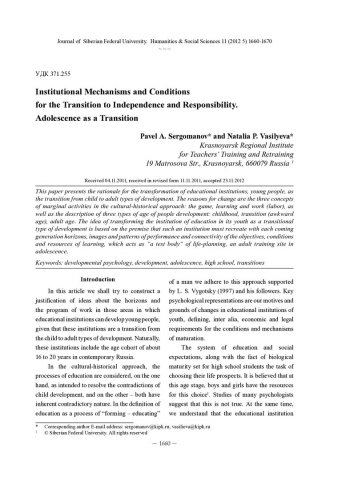 Библиографическое описание:Sergomanov, Pavel. Institutional Mechanisms and Conditions for the Transition to Independence and Responsibility. Adolescence as a Transition = Институциональные механизмы и условия перехода к самостоятельности и ответственности. Юношеский возраст как переходный / P. A. Sergomanov, N. P. Vasilyeva. - Текст : непосредственный // Журнал Сибирского федерального университета. Гуманитарные науки. - 2012. - Т. 5, № 11. - С. 1660-1670 : ил. - Библиогр.: с. 1669. - ISSN 1997-1370.