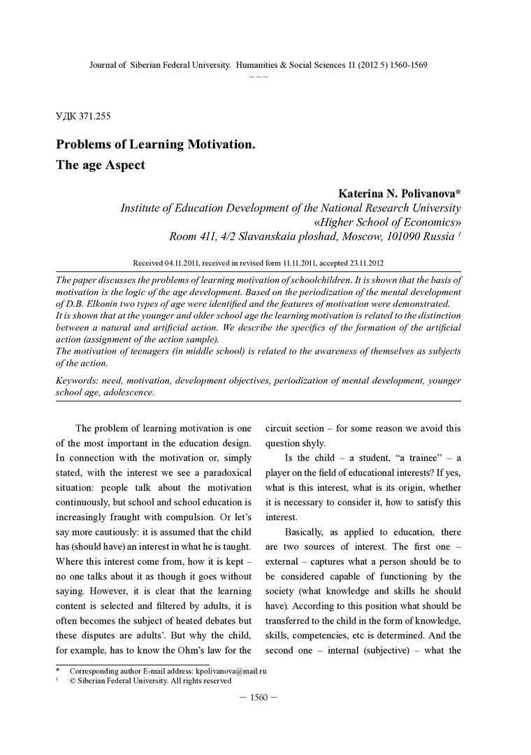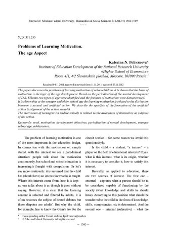 Библиографическое описание: Polivanova, Katerina. Problems of Learning Motivation. The age Aspect = Проблемы мотивации учения. Возрастной аспект / K. N. Polivanova. - Текст : непосредственный // Журнал Сибирского федерального университета. Гуманитарные науки. - 2012. - Т. 5, № 11. - С. 1560-1569. - Библиогр.: с. 1568. - ISSN 1997-1370.