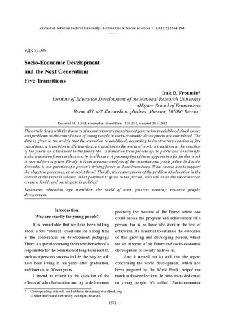 Библиографическое описание: Froumin, Isak. Socio-Economic Development and the Next Generation: Five TrasiTions = Социально-экономическое развитие и следующее поколение: пять переходов / I. D. Froumin. - Текст : непосредственный // Журнал Сибирского федерального университета. Гуманитарные науки. - 2012. - Т. 5, № 11. - С. 1534-1541 : ил. - ISSN 1997-1370.