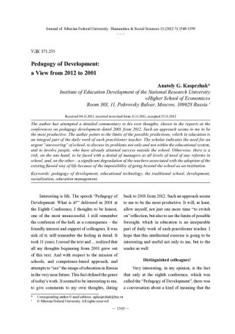 Библиографическое описание: Kasprzhak, Anatoly. Pedagogy of Development: a View from 2012 to 2001 = Педагогика развития: взгляд из 2012 - в 2001 / A. G. Kasprzhak. - Текст : непосредственный // Журнал Сибирского федерального университета. Гуманитарные науки. - 2012. - Т. 5, № 11. - С. 1549-1559. - Библиогр.: с. 1558 (25 назв.). - ISSN 1997-1370.