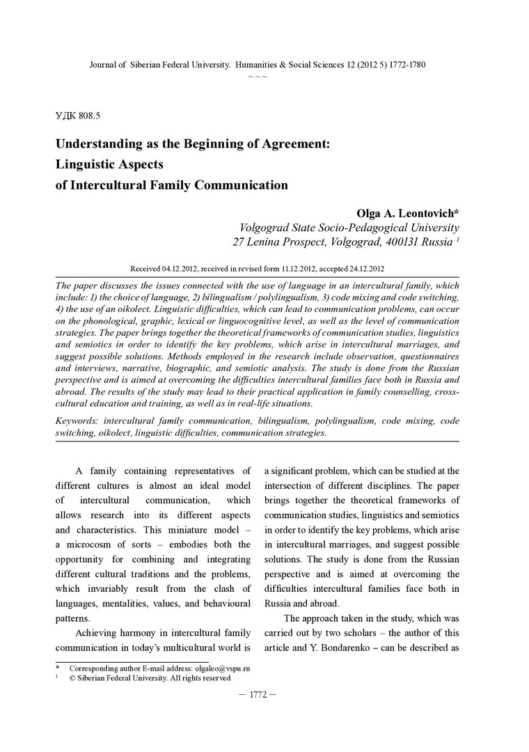 Библиографическое описание: Leontovich, Olga. Understanding as the Beginning of Agreement: Linguistic Aspects of InterCultural Family Communication = Понимание - начало согласия: проблемы межкультурной семейной коммуникации / O. A. Leontovich. - Текст : непосредственный // Журнал Сибирского федерального университета. Гуманитарные науки. - 2012. - Т. 5, № 12. - С. 1772-1780. - Библиогр.: с. 1779-1780. - ISSN 1997-1370.
