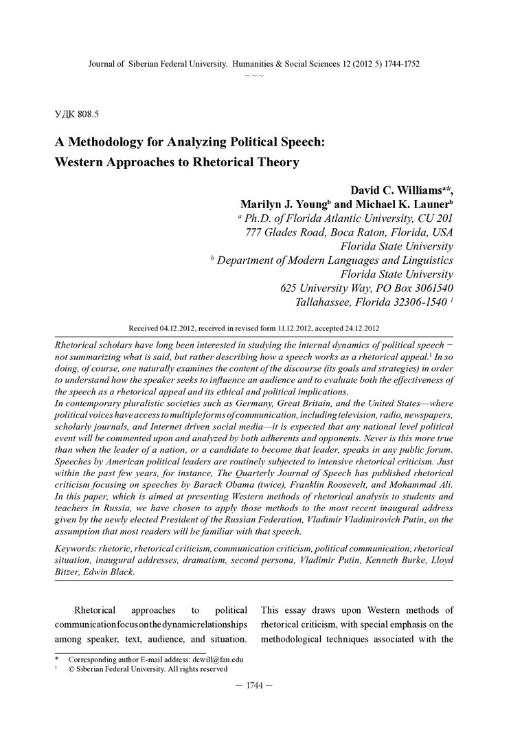 Библиографическое описание: Williams, David. A Methodology for Analyzing Political Speech: Western Apporoaches to Rhetorical Theory = Методика анализа выступлений политиков: подходы западных специалистов к разработке теории риторики / D. C. Williams, M. J. Young, M. K. Launer. - Текст : непосредственный // Журнал Сибирского федерального университета. Гуманитарные науки. - 2012. - Т. 5, № 12. - С. 1744-1752. - Библиогр.: с. 1750-1751. - ISSN 1997-1370.