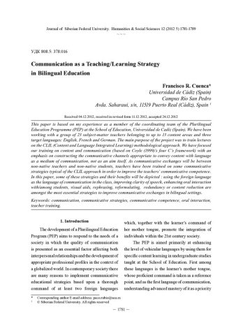 Библиографическое описание: Cuenca, Francisco. Communication as a Teaching/Learning Strategy in Bilingual Education = Коммуникация как обучающая стратегия в билингвальном образовании / F. R. Cuenca. - Текст : непосредственный // Журнал Сибирского федерального университета. Гуманитарные науки. - 2012. - Т. 5, № 12. - С. 1781-1789 : ил. - Библиогр.: с. 1787-1789. - ISSN 1997-1370.
