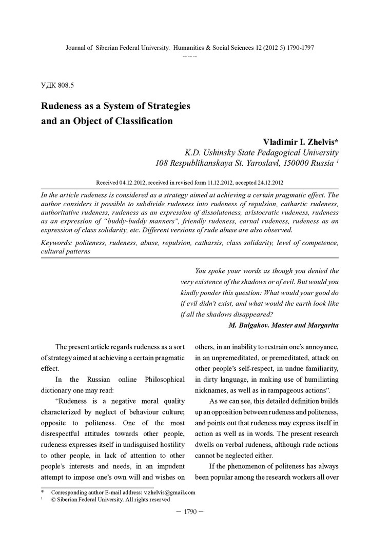 Библиографическое описание:Zhelvis, Vladimir. Rudeness as a System of Strategies and an Object of Classification = Грубость как система стратегий и объект классификации / V. I. Zhelvis. - Текст : непосредственный // Журнал Сибирского федерального университета. Гуманитарные науки. - 2012. - Т. 5, № 12. - С. 1790-1797. - Библиогр.: с. 1796. - ISSN 1997-1370.