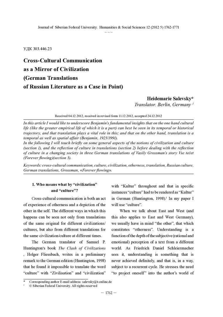 Библиографическое описание:Salevsky, Heidemarie. Cross-Cultural Communication as a Mirror of Civilization (German Translations of Russian Literature as a Case in Point) = Межкультурная коммуникация как зеркало изменяющейся цивилизации (Перевод на немецкий русскоязычной литературы) / H. Salevsky. - Текст : непосредственный // Журнал Сибирского федерального университета. Гуманитарные науки. - 2012. - Т. 5, № 12. - С. 1762-1771. - Библиогр.: с. 1769-1771. - ISSN 1997-1370.