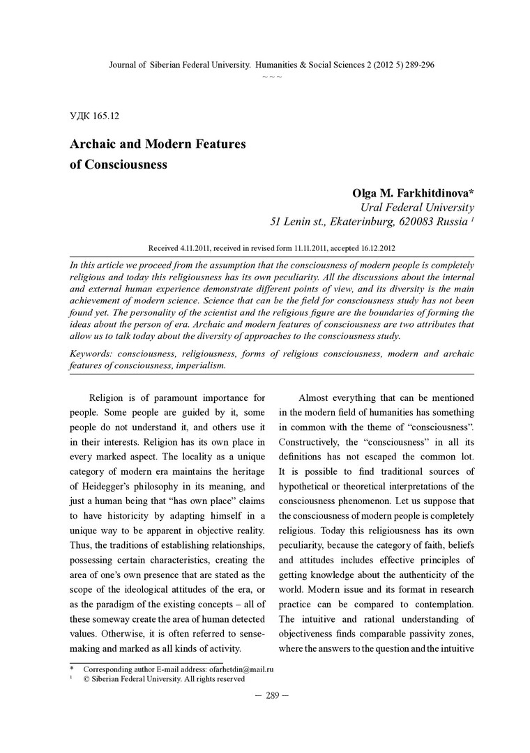 Библиографическое описание: Farkhitdinova, Olga. Archaic and Modern Features of Consciousness = Архаика и современность сознания / O. M. Farkhitdinova. - Текст : непосредственный // Журнал Сибирского федерального университета. Гуманитарные науки. - 2012. - Т. 5, № 2. - С. 289-296. - Библиогр.: с. 295. - ISSN 1997-1370.