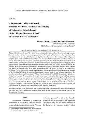 Adaptation of Indigenous Youth from the Northern Territories to Studying at University: Establishment of the "Higher Northern School" in Siberian Federal Universityстатья из журнала