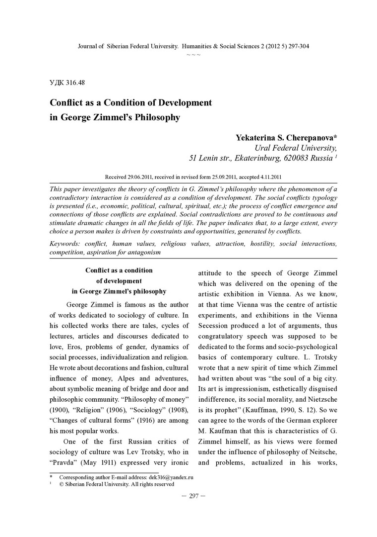 Библиографическое описание: Cherepanova, Yekaterina. Conflict as a Condition of Development in George Zimmel`s Philosophy = Конфликт как условие развития в философии Г. Зиммеля / Y. S. Cherepanova. - Текст : непосредственный // Журнал Сибирского федерального университета. Гуманитарные науки. - 2012. - Т. 5, № 2. - С. 297-304. - Библиогр.: с. 304. - ISSN 1997-1370.