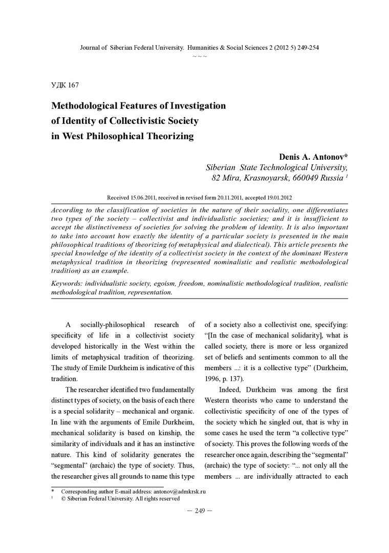 Библиографическое описание: Antonov, Denis. Methodological Features of Investigation of Identity of Collectivistic Society in West Philosophical Theorizing = Методологические особенности познания идентичности коллективистского общества в западном философском теоретизировании / D. A. Antonov. - Текст : непосредственный // Журнал Сибирского федерального университета. Гуманитарные науки. - 2012. - Т. 5, № 2. - С. 249-254. - Библиогр.: с. 253-254. - ISSN 1997-1370.