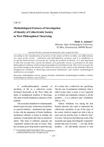 Methodological Features of Investigation of Identity of Collectivistic Society in West Philosophical Theorizingстатья из журнала