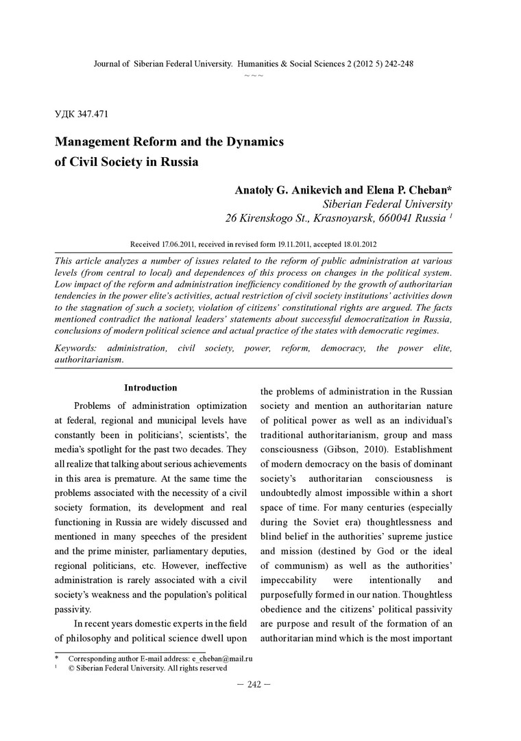 Библиографическое описание: Anikevich, Anatoly. Management Reform and the Dynamics of Civil Society in Russia = Реформы системы управления и динамика гражданского общества в России / A. G. Anikevich, E. P. Cheban. - Текст : непосредственный // Журнал Сибирского федерального университета. Гуманитарные науки. - 2012. - Т. 5, № 2. - С. 242-248. - Библиогр.: с. 246-248. - ISSN 1997-1370.